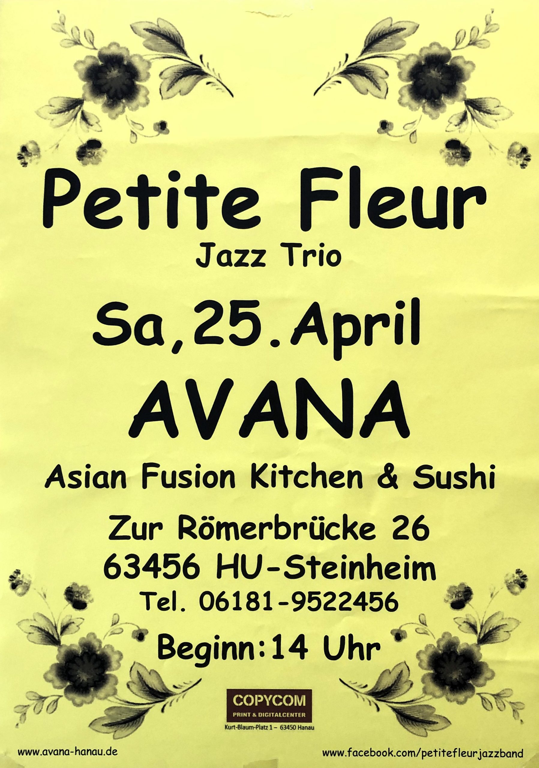25. April 2026, 14 Uhr, AVANA Asian Fusion Kitchen, Zur Römerbrücke 25, 63456 HU-Steinheim, Petite Fleur Jazz Trio